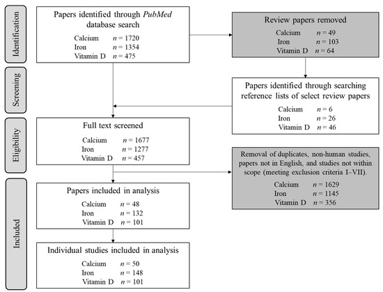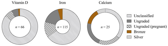 The following supporting information can be downloaded at: https://www.mdpi.com/article/10.3390/nu14163372/s1, Figure S1: Calcium flowchart. Male (M), female (F), menstruating (men), hormonal contraception (HC). Bold text denotes papers, non-bold typeface is used for studies. From section B onwards, all counts, and percentages refer to individual studies (not papers). The methodological standard of classified studies in metric C, step 2 excludes pregnant women. * studies comparing unclassified vs. Tier 1, ^ studies comparing unclassified vs. Tier 2, ◊ studies comparing tier 0 vs. 2. Figure S2: Iron flowchart. Male (M), female (F), menstruating (men), hormonal contraception (HC). Bold text denotes papers, non-bold typeface is used for studies. From section B onwards, all counts, and percentages refer to individual studies (not papers). The methodological standard of classified studies in metric C, step 2 excludes pregnant women. † studies comparing unclassified vs. tier 4. Figure S3: Vitamin D flowchart. Male (M), female (F), menstruating (men), hormonal contraception (HC). Bold text denotes papers, non-bold typeface is used for studies. From section B onwards, all counts, and percentages refer to individual studies (not papers). The methodological standard of classified studies in metric C, step 2 excludes pregnant women.