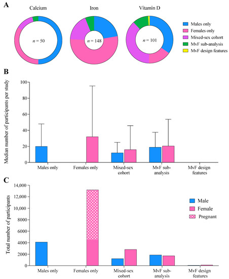 We undertook a literature audit to examine the representation of women in the evidence base guiding the use of medical supplements (calcium, iron, and vitamin D) to prevent/treat clinical issues in athletes [1,2,3]. Although we were interested in the use of these supplements in sports nutrition, we audited the broader literature that typically informs practices around medical supplement use. Women accounted for the majority (71%) of participants, while 69% of studies included at least one woman. Female-only study designs included ~3 times more participants than studies investigating exclusively males, mostly due to the large number of studies involving pregnant women. Indeed, 26 studies investigating pregnant women accounted for 9% of the total studies but contributed 50% (8909 individuals) of the total female participants. Female representation in this medical supplement field was greater than that previously observed across other themes [14,21,22,23,24], which may reflect a higher prevalence of micronutrient deficiencies or sub-optimal intake, particularly iron deficiency/anaemia, among women [25,26]. However, there was minimal exploration of sex-specific differences in supplement response, with just 4–11% of studies allowing comparisons between men and women in the statistical analysis and only one study designed to investigate sex-based responses. Furthermore, widespread inadequacies in methodological design regarding menstrual function preclude insights into the effects of these parameters on micronutrient metabolism and supplement responses, an important area for athletes because of the potential for acute interactions with strenuous exercise [27,28,29,30,31,32].
