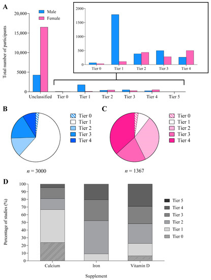 Across the 32% (96/299) of studies that could be classified into an athletic tier, 41 were considered Tiers 3–4 [17] (i.e., at least highly trained/national level), of which 29 included women. When separated by supplement, Tier 3–4 athletes participated more frequently in studies of iron (48% of participants, n = 21 studies) and vitamin D supplementation (52%, n = 16 studies), while calcium (19%, n = 4 studies) involved the lowest percentage of athletes from these tiers (Figure 4D). Of the 29 studies including female athletes (Tiers 3–4), menstrual status was unclassified in 22, and 2.3 of the remaining 7 studies achieved a bronze standard of methodological control with the remainder ungraded. Outcome measures were evenly split among studies including Tier 3–4 athletes, with 36% examining indirect associations with performance/health or direct health measures and 27% investigating performance. Most (44%) studies investigating athletes examined strategies to treat a nutrient deficiency.