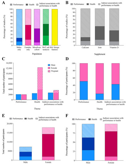 The percentage of studies in each theme: performance (direct performance outcomes), health (outcomes related to health status/condition), and indirect associations with performance/health (physiological or psychological adaptation/response that may subsequently transfer to athletic performance/health), separated by (A) population and (B) supplement. The total number (C) and proportion (D) of male and female participants in each research theme. The total (E) and proportion (F) of male and female participants involved in studies measuring outcomes of performance, health, or indirect associations with performance or health.