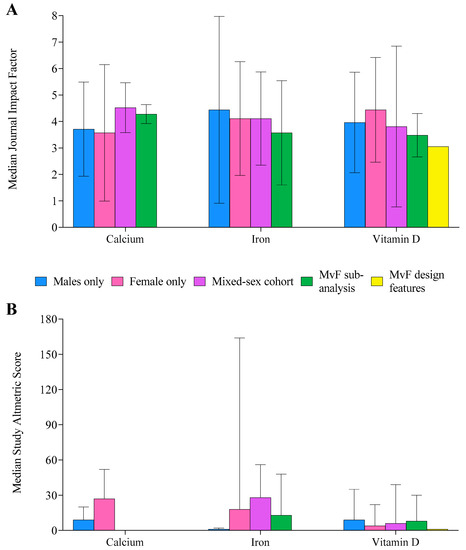 The median IF of journals in which studies were published was 3.9 ± 2.3 (Figure 7). Altmetric scores were only available for 45% of studies (n = 133) and were highly variable, with a median score of 7 ± 28 (Figure 7). Overall, 16% of studies (n = 47) achieved Altmetric scores > 20. Although studies investigating MvFsub had the greatest proportion of scores > 20 (n = 5 studies, 23%), the total number of such studies (n = 22) was low. Overall, vitamin D (n = 24 studies, 24%) and iron (n = 20 studies, 14%) had more studies with Altmetric scores > 20 than the calcium literature (n = 3, 6%).