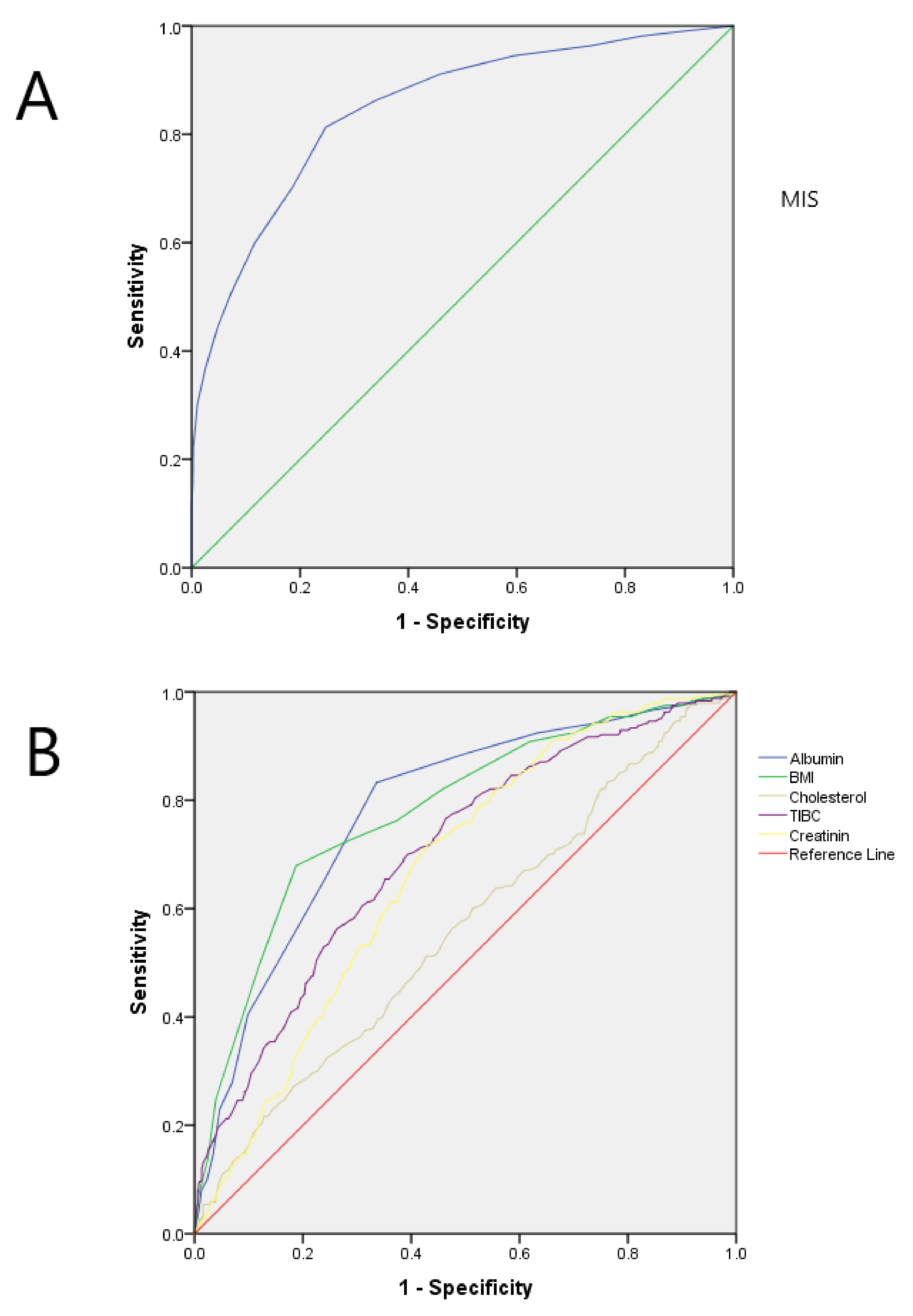 - For the biochemical parameters section, albumin < 3.8 g/dL or cholesterol <100 mg/dL were used.