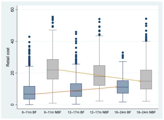 Box plots for the retail cost values per age group and diet type. BF, breastfed; m, months; NBF, non-breastfed.
