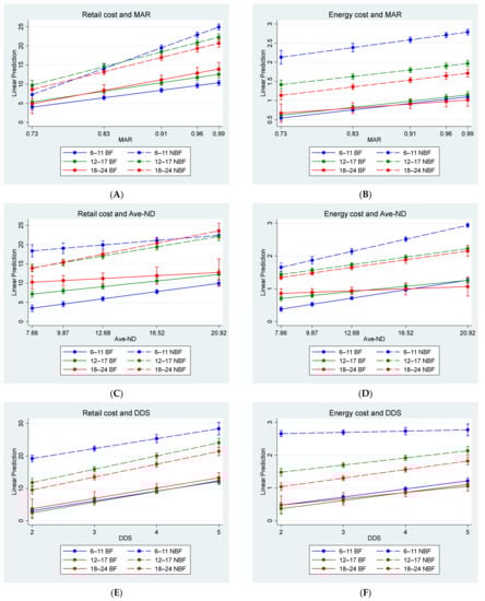 Spearman correlation coefficients are indicated in Table 3, and the results of the median regression analysis adjusted for age-group and diet type (BF, NBF) are indicated in Figure 2A–F. Retail cost and energy cost were significantly correlated for BF and NBF diets for all three age categories. Both retail cost and energy cost were positively correlated with MAR and DDS for BF and NBF diets in all three age categories, except energy cost for the NBF-diet at 6–11 months, which did not correlate with MAR. The positive associations of cost with MAR and DDS respectively are illustrated in Figure 2. The figure further illustrates that the difference in cost between the BF-diet and NBF-diet is biggest at age 6–11 months and smallest at age 18–24 months. Positive correlations of retail cost and energy cost with Ave-ND were significant; however, the correlations were mostly weak for retail cost. Table 3 further shows that MAR and DDS were positively correlated for BF and NBF diets in all three age categories.