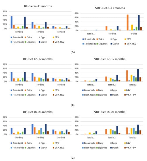 (A). Food groups included in the BF and NBF diets across the cost tertiles for 6–11 months. (B). Food groups included in the BF and NBF diets across the cost tertiles for 12–17 months. (C). Food groups included in the BF and NBF diets across the cost tertiles for 18–24 months. BF, breastfed; F&V, fruits and vegetables; NBF, non-breastfed.