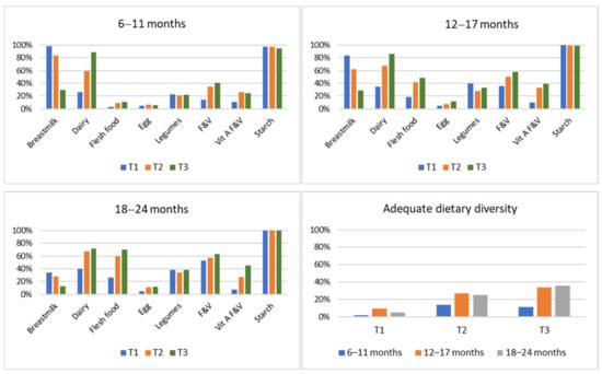 Table 4 shows food groups predominantly (at least 50%) included in the diet for the cost retail tertiles. The lowest cost diet (T1) predominantly consisted of cereals/root/tubers and breastmilk for the two younger age categories, and of cereals/root/tubers and fruit and vegetables (other than vitamin A-rich) for 18–24 months. Diets with the highest cost (T3) predominantly consisted of cereals/root/tubers and dairy for 6–11 months, of cereals/root/tubers, fruit and vegetables (other than vitamin A-rich), and dairy for 12–17 months, and of cereals/root/tubers, fruit and vegetables (other than vitamin A-rich), dairy, and flesh food for 18–24 months.