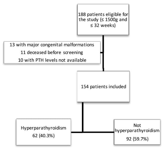 During the study period, 188 preterm infants with a GA < 32 weeks were born at the study center. Thirteen patients were excluded due to major congenital malformations, 11 due to death prior to MBD screening and 10 due to no available PTH levels because of an insufficient blood sample. Finally, a total of 154 patients were included in this study (see flow-chart in Figure 1).