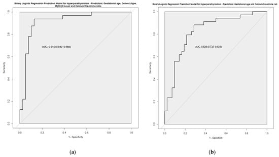 The multivariate analysis adjusted by GA is shown in Table 3 and Figure 2. Among clinical variables, cesarean section, oxygen during resuscitation, IMV and anemia requiring transfusion remained as factors favoring HPTH. By contrast, the fortification of breastfeeding was protective for HPTH. Based on these results, and together with analytical variables, predictive models for HPTH were developed. Finally, the predictive model with the highest Area Under the ROC curve (AUC) included GA, vitamin D, type of delivery, and urinary Ca/Cr ratio. With this model, an AUC of 0.915 was obtained with a sensitivity of 0.938 and a specificity of 0.872 (Figure 3a). A simplified model considering just GA and urinary Ca/Cr ratio was developed without sacrificing its good performance (AUC 0.828) (Figure 3b).