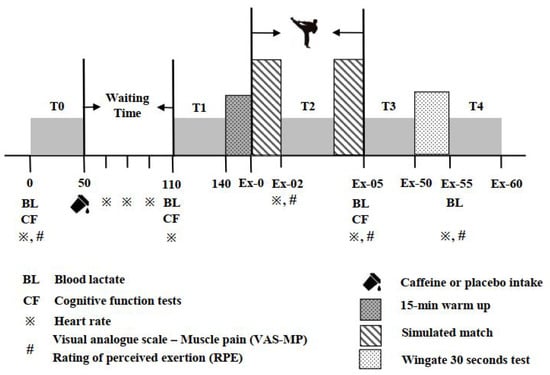 Prior to the experiments, information was obtained on the participants’ personal background, taekwondo experience, daily food intake and fitness workout regimen 3 days before the experiment, and caffeine intake history. Among all the participants, 3 of them consumed coffee every day and the other 7 participants consumed coffee 3–4 times/week. The participants were required to wear sportswear and a body protector (including a full dobok, head, body, arm, shin, hand, and foot protectors) during the matches and to avoid any vigorous exercise 24 h before each main trial. A preliminary trial was conducted with the adopted experimental procedure prior to the main trials to help the participants become familiar with the procedure and cognitive function tests. The participants were prohibited from obtaining any kind of caffeine, sports supplements, or stimulants 24 h prior to the experiment regardless of their regular caffeine intake habit. Three days before the first main trial, participants were required to record their food intake. Participants were also required to repeat their own dietary records before their second main trial. To be well hydrated, all participants were instructed to drink sufficiently during the day before the main trial and ingest at least 500 mL of water on the day before the commencement of the main trials. They were also constantly reminded to drink regularly during the experiment.