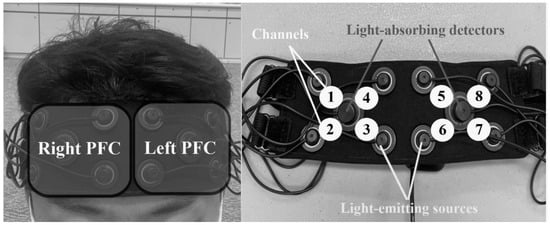 During the cognitive function tests, a multi-channel fNIRS system using two wavelengths of infrared light (751 and 839 nm) was adopted to scan cortical areas underlying the forehead for determining the prefrontal cortex (PFC) oxygenation levels of participants. The fNIRS (OctaMon System, Artinis Medical Systems, Gelderland, The Netherlands) device had two sets of 1 × 4 multichannel probe holders, which consisted of 8 light- emitting sources and 2 light-absorbing detectors arranged alternately at an inter-probe distance of 3.5 cm. This configuration thus resulted in 4 channels per set (a total of eight channels). Optode position was set and covered the participants’ prefrontal brain area according to the international 10–20 system with FPz located between optodes 3 and 6 (