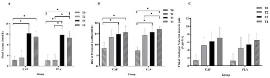 No differences were observed in blood lactate concentration, HR, RPE, and VAS-MP scores between the CAF and PLA trials. However, the increase in the RPE from T2 to T4 was significant in the PLA trial but not in the CAF trial. Moreover, compared with those in PLA trials, the RPE in the CAF trial was reduced approximately by 6.2% after the first round of the simulated match (T2), 5.69% after the second round of the simulated match (T3), and 8.1% after the WAnT (T4) (