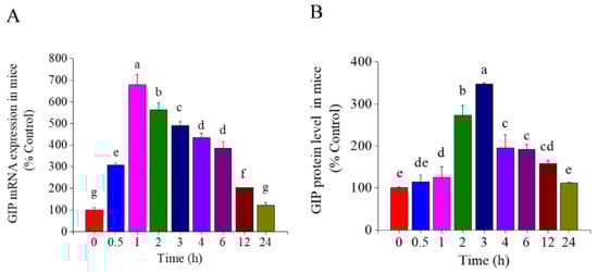 Mice were administered with TSS by single gavage at the dose of 65mg/kg BW. As shown in Figure 1, the mRNA and protein levels of GIP in the small intestine of mice both significantly increased during the first several hours and then decreased (p < 0.05). The highest expression of GIP mRNA and protein occurred at 1 and 3 h, which were 6.8-fold and 2.7-fold higher than that of the control group, respectively. Numerous studies have demonstrated asynchrony in mRNA and protein expression, possibly due to differences in the timing and location of eukaryotic gene transcription and translation.