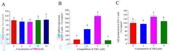 Effect of TSE1 on the GIP expression in STC-1 cells at 24 h. (A) Cell viability after 24 h treatment of TSE1 determined by MTT assay. (B) The mRNA expression of GIP determined by RT-PCR. (C) The protein level of GIP in the cell culture media determined by ELISA. Different letters indicate significant difference among groups (p < 0.05).