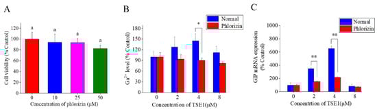 Phlorizin, a dihydrochalcone from the bark of pears, apples, cherries and other fruits, is a known inhibitor of SGLT1 []. In this work, phlorizin was used to clarify the effect of SGLT1 on TSE1-induced GIP secretion. Figure 3A shows that the cell viability did not change obviously at 10 and 25 µM of phlorizin, and slightly decreased by 17% at 50 µM (p > 0.05). Therefore, 25 µM of phlorizin was used in subsequent experiments. As shown in Figure 3B,C, phlorizin could significantly reverse the increase in intracellular Ca2+ concentration (p < 0.05) and GIP mRNA level (p < 0.01) induced by TSE1 at 2 and 4 µM, indicating that SGLT1 played a key role in TSE1-induced GIP expression.