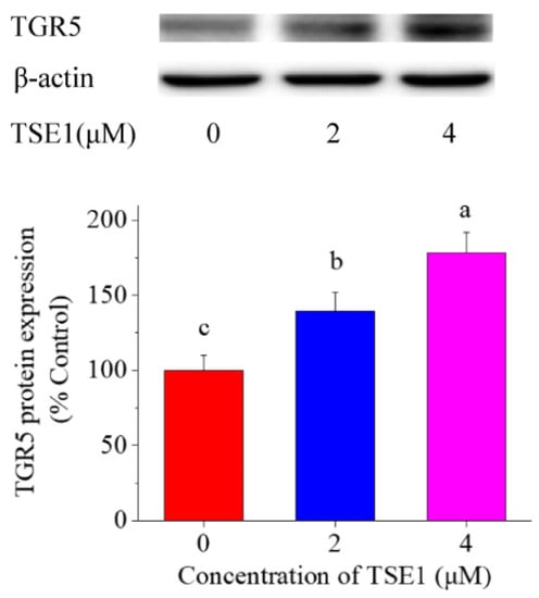 Effect of TSE1 on the TGR5 protein expression in STC-1 cells at 24 h. Protein levels were detected by Western blot, and analyzed by the ImageJ software. Different letters indicate significant difference among groups (p < 0.05).