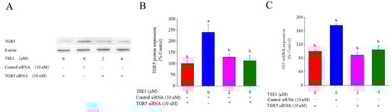 In order to clarify whether TGR5 is involved in the regulation of GIP by TSE1, TGR5 was knocked down in STC-1 cells by siRNA approach. As shown in Figure 5A,B, TGR5 siRNA effectively reduced the protein expression of TGR5 compared with the controls, meanwhile, it significantly suppressed TSE1-induced upregulation of TGR5 (p < 0.05). Figure 5C shows that TSE1 did not enhance GIP mRNA expression after treatment with TGR5 siRNA, indicating that TSE1-induced GIP upregulation through activating TGR5 in the STC-1 cells.