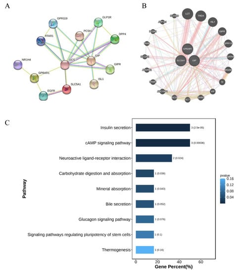 Protein–protein interaction (PPI) network of TGR5 (GPBAR1), SGLT1 (SLC5A1) and GIP. (A) The PPI network plotting constructed by the STRING database. (B) The PPI network plotting constructed by the GeneMANIA database. (C) KEGG enrichment analysis of target proteins.