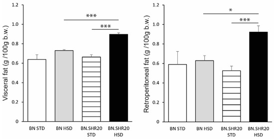 Body weight did not differ between strains in control or HSD-fed groups. While HSD led to an increase in body weight in BN (BN-STD: 209 ± 9 g vs. BN-HSD: 238 ± 3 g, p = 0.025), there was no effect on the relative weights of either visceral or retroperitoneal adipose tissue depots in this strain (Figure 2). On the contrary, BN.SHR20 showed a marked increase in adiposity (Figure 2) despite no significant change in the total body weight (BN.SHR20-STD: 226 ± 3 g vs. BN.SHR20-HSD: 241 ± 8 g, p = 0.08).