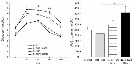 Oral glucose tolerance test and the area under the glycemic curve (AUC0–180). The course of glycemia during OGTT is shown (left) in sucrose-fed (HSD, closed symbols) and control (STD, open symbols) adult male rats of BN (squares) vs. BN.SHR20 (triangles) strains. Within the graphs, the significance levels of pairwise comparisons (BN.SHR20 STD vs. HSD for OGTT; BN-HSD vs. BN.SHR20-HSD for AUC) by post-hoc Tukey’s honest significance difference test of the two-way ANOVA with STRAIN and DIET as major factors are indicated as follows: * p < 0.05; ** p < 0.01.