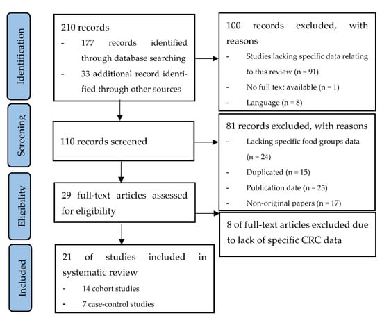 The limitations of this review include: (i) the heterogeneous nature of the studies, including the study population characteristics, sample size, study design, and follow-up periods; (ii) being observational studies, residual confounding can be a problem, and not all studies were adjusted for important confounders; (iii) in the same way, since these are observational studies, the results cannot support the causal relationship between food group consumption and CRC risk; and (iv) the fact that some studies used self-reported data on the dietary intake may affect the reliability of the reported data, although the use of validated questionnaires could reduce this bias.