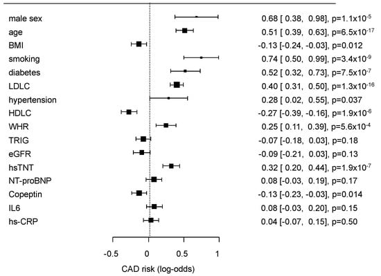 Results of multivariate analysis of classical risk factors and the selected biomarkers for the risk prediction of coronary artery disease (CAD0 vs. CAD1 + 2). The results are given as log-odds ratios, confidence intervals (CIs), and p-values.