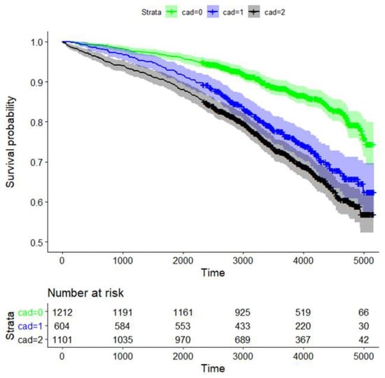 Survival of patients with CAD0 vs. CAD1, CAD0 vs. CAD2, and CAD1 vs. CAD2 was significantly different, with p-values of 2.4 × 10−10, 1.2 × 10−23, and 0.018, respectively (Figure 2). Thus, survival rates of CAD1 and CAD2 were similar.