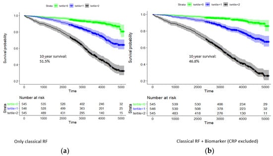 Kaplan–Meier curve analysis for 10-year survival of patients in the group CAD1 + CAD2: dependence on tertiles of a classical risk score and that combined with the biomarkers hsTNT, NT-proBNP, copeptin, and IL-6. Time is given in days. Strata: tertile 0 (green), tertile 1 (blue), and tertile 2 (black). (a) Classical risk factors: 10-year survival rate in highest tertile, 51.5%. (b) Classical risk factors and hs-cTnT, NT-proBNP, copeptin, and IL-6: 10-year survival in highest tertile, 46.8%.