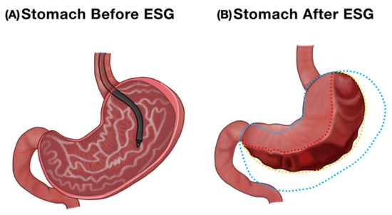 - Abu Dayyeh, B.K.; Acosta, A.; Camilleri, M.; Mundi, M.S.; Rajan, E.; Topazian, M.D.; Gostout, C.J. Endoscopic Sleeve Gastroplasty Alters Gastric Physiology and Induces Loss of Body Weight in Obese Individuals. Clin. Gastroenterol. Hepatol. 2017, 15, 37–43. [Google Scholar] [CrossRef] [PubMed] [Green Version]