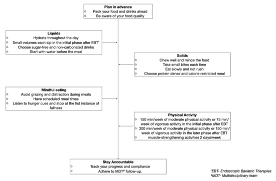 There is a scarcity of literature surrounding type of meal planning for the long term after EBTs. The limited evidence focuses on use of either the Mediterranean diet or the high-protein diet [36]. The Mediterranean diet (carbohydrates—53%, proteins—22%, and fats—25%) is characterized by an abundance of plant-based foods, a moderate intake of fish and dairy, a low intake of red meat, and the use of extra virgin olive oil as the main source of dietary fat. The anti-inflammatory and anti-oxidant property of the Mediterranean diet has been postulated to promote weight loss and improvement on comorbidities. Short-term studies (3 months) have demonstrated superiority of the Mediterranean diet over the high-protein diet in inducing weight loss in obesity. However, long-term studies in EBTs are lacking.