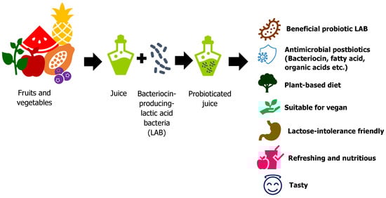 Up until now, the global probiotic drink market has been dominated by dairy-based beverages []. However, in recent years, the demand for plant-based products is growing at a faster rate, with an increased demand for the incorporation of probiotics in fruit and vegetable juices. The increased awareness of the allergenicity and high levels of cholesterol and fats in milk has incited a shift in the preference of consumers to healthier alternatives [], as even soybean products could also impose on the soy allergies of some consumers []. Furthermore, lactose-intolerance and vegetarian, animal, and environmental activism have driven companies to expand their businesses into dairy-free and vegan-based drinks. Thus, the utilization of fruits and vegetables to make probiotic drinks must be developed to meet the demand for dairy alternatives and vegan-based drinks. The summary of stages involved in the production of non-dairy-based probiotic products and the benefits of probioticated plant-based juice is shown in Figure 1.