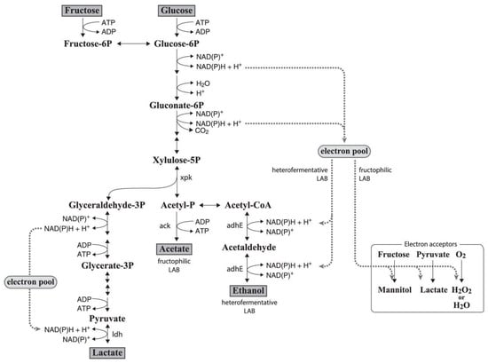 Normally, an obligately heterofermentative LAB metabolizes glucose through the phosphoketolase pathway, but Fructobacillus spp. does not seem to express the adhE gene needed to produce the enzyme for conversion of acetyl phosphate to ethanol []. Moreover, the conversion of acetyl phosphate to ethanol contributes to the oxidation of NADH to NAD. Hence, the missing step in the NADH production upstream of the phosphoketolase pathway causes a shortage in NADH to metabolize sugar. Endo [] revealed that Fructobacillus tropaeoli F214-1T has the maximum growth curve on glucose under aerobic conditions, followed by glucose in the presence of pyruvate, on fructose media, and lastly the lowest growth curve on glucose. This finding suggests that pyruvate and oxygen are used as the external electron acceptor for FLAB to grow on glucose substrates. Furthermore, FLAB can also use phenolic acids as the external electron acceptors []. As seen in Figure 3, FLAB utilizes fructose, pyruvate, and oxygen as electron acceptors to produce mannitol, lactate, and water, respectively.