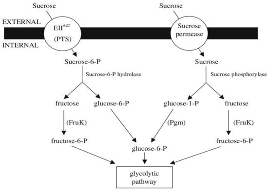 The ability of LAB in sucrose metabolism depends on the expression of specific sucrose permease and/or sucrose-hydrolyzing enzymes. Bacteria can express two types of permeases, which are the phosphotransferase system sucrose-specific EII component (PTS-EIIscr) and sucrose permease. The PTS-EIIscr modifies external sucrose into sucrose-6-phosphate and takes it up into the cytosol, while the non-PTS sucrose permease allows entry of the unmodified sucrose []. Additionally, bacteria can secrete sucrose-hydrolyzing enzymes such as β-fructofuranosidases and sucrose-6-phosphate hydrolases. The β-fructofuranosidases belongs to family with 32 members of the glycosyl hydrolase that catalyze the hydrolysis of high-molecular-weight fructose polymers. Meanwhile, sucrose-6-phosphate hydrolases also belongs to the same glycosyl hydrolase group but specifically to hydrolase low-molecular-weight fructoses such as sucrose and raffinose.