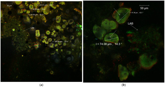 Confocal laser scanning microscopy images of co-microencapsulated extract from Cornelian cherry fruits with L. casei 431® in whey protein isolates and casein (a) and whey protein isolates and inulin (b) stained with fluorophores.