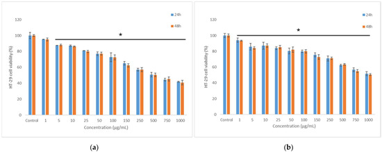 Cell viability of L929 fibroblasts cultivated in the presence of co-microencapsulated extract from cornelian cherry fruits with L. casei 431® in whey protein isolates and inulin (a) and in whey protein isolates and casein (b) for 24 h and 48 h, respectively, determined by NR assay. The results were expressed as percent relative to the untreated culture (control), considered 100% viable. The values represent mean ± SD (n = 3), * p < 0.05, compared to control.