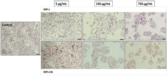 The effect of powders on cell viability decreased under 80% at concentrations higher than 100 µg/mL. The EC50 values were calculated in the range of 750–1000 µg/mL, with WPI-I powder having the most prominent anti-proliferative activity. Microscopy investigation of the tumoral cells morphology confirmed the NR quantitative data (Figure 5). The micrographs showed a concentration-dependent decrease of the cell density for both variants of co-microencapsulated powders. Even though treated cells maintained their normal aggregative phenotype, the cell viability and proliferation were severely affected, at concentrations higher than 250 and 750 µg/mL of WPI-I and WPI-CN variants, respectively.