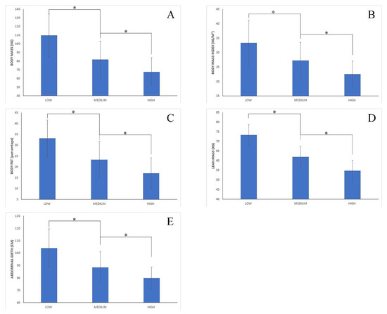 Anthropometric variables. Comparison between cohorts based on their level of adherence to the Mediterranean diet (low vs. medium vs. high). (A) Body mass (Kg); (B) body mass index (Kg/m2); (C) body fat percentage (%); (D) lean mass (kg); (E) abdominal girth (cm); *: significant difference (p < 0.05).