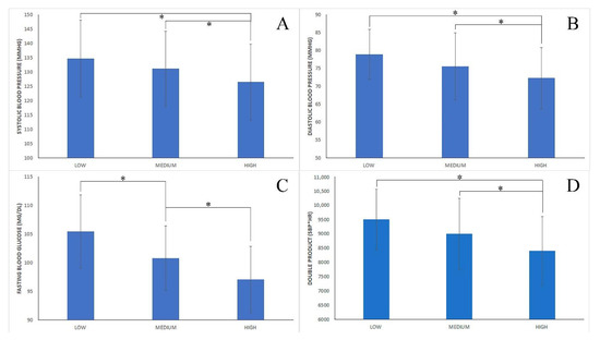 Health variables. Comparison between cohorts based on their level of adherence to the Mediterranean diet (low vs. medium vs. high). (A) Systolic blood pressure (mmHg); (B) diastolic blood pressure (mmHg); (C) fasting blood glucose (mg/dL); (D) double product (SBP × HR); *: significant difference (p < 0.05).