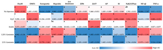 Effect of intraamniotic administration of genistein and controls on duodenal and liver (hepcidin) mRNA gene expression. Gene expression has been normalized to the 18S housekeeping gene and is in arbitrary units (AU). Values are presented as mean ± SEM, n = 6. a–c Per gene (in the same column), treatments groups not indicated by the same letter are significantly different (p < 0.05) according to one-way ANOVA with post-hoc Duncan test. DcytB, duodenal cytochrome b; DMT1, divalent metal transporter 1; ZIP6, zinc transport protein 6; ZnT7, zinc transporter 7; AP, amino peptidase; SI, sucrose isomaltase; NaK/ATPase, sodium, potassium and adenosine triphosphate; NF-κβ, nuclear factor kappa β subunit 1; TNF-α, tumor necrosis factor-α.