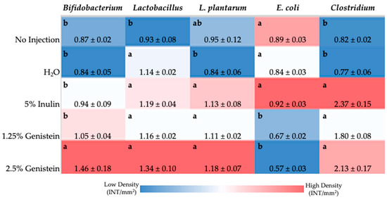 The body weight of the 2.5% genistein group is significantly higher than the no-injection group (p < 0.05, Table 2). For cecum weights, the no-injection and H2O groups demonstrate significantly greater values when compared to the 5% inulin and 2.5% genistein groups (p < 0.05).