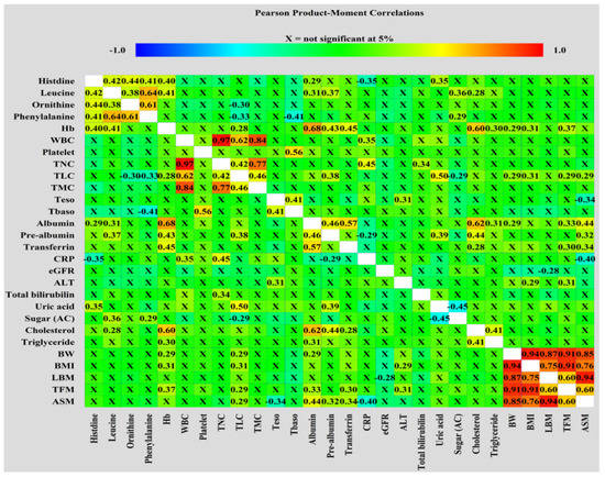 Figure 1 shows the associations among pretreatment levels of biochemical and anthropometric variables, NIBs, DXA-related measurements, and serum metabolites. The four amino acid metabolites were positively correlated with each other. Histidine levels were positively correlated with the levels of albumin and uric acid but negatively correlated with the CRP levels. Leucine showed positive correlation with albumin, prealbumin, fasting sugar, and cholesterol levels. Ornithine and phenylalanine levels negatively correlated with TLC. Hb levels were positively correlated with histidine, leucine, albumin, prealbumin, transferrin, cholesterol, TG, BW, and BMI. Albumin positively correlated with prealbumin, transferrin, cholesterol, TG, and BW. All pretreatment values of BW, BMI, and DXA-associated measurements were positively correlated with each other. The TFM was positively correlated with Hb, TLC, albumin, transferrin, and ALT levels. ASM was positively correlated with albumin, prealbumin, transferrin, and TLC but negatively correlated with CRP levels. This correlation analysis suggests an intricate and tight relationship between the pretreatment levels of various blood-related variables and anthropometric and body composition parameters.
