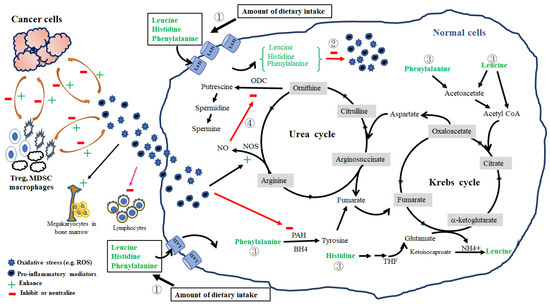 Four possible mechanisms responsible for serum levels of histidine, leucine, ornithine, and phenylalanine in patients with LAHNSCC before concurrent chemoradiotherapy. They include: amount of dietary intake (①), consumption in the neutralization against oxidative and pro-inflammatory stress (②), fuel provider for energy production (③), and nitric oxide synthase (NOS)–nitric oxide (NO) pathway (④). First, reduced dietary intake directly results in decreased serum levels of essential amino acids (histidine, leucine, and phenylalanine). Second, essential amino acids are delivered into cells via L-type amino acid transporter 1 (LAT1); once inside, they can neutralize the reactive oxygen species (ROS) and pro-inflammatory mediators using their antioxidative and anti-inflammatory activities or enter into the Krebs cycle for energy production to compensate calorie deficiency from inadequate food intake. Finally, ROS and pro-inflammatory mediators can stimulate thrombopoiesis from mature megakaryocytes in the bone marrow, inhibit lymphocyte differentiation and proliferation, and upregulate NOS and NO production. Produced NO can decrease ornithine decarboxylase (ODC) activity and increase the ornithine levels. The magnitude of oxidative stress and pro-inflammatory mediators are reciprocally regulated by cancer and immune cells, such as regulatory T cells (Treg), macrophages, and myeloid-derived suppressor cells (MDSC), within the tumor microenvironment and in the peripheral blood. ROS and pro-inflammatory mediators can reduce the function of phenylalanine hydroxylase (PAH) and prevent the conversion of phenylalanine to tyrosine. Tetrahydrobiopterin (BH4) and tetrahydrofolate (THF) are essential cofactors for the conversion of phenylalanine into tyrosine and histidine into glutamate, respectively.