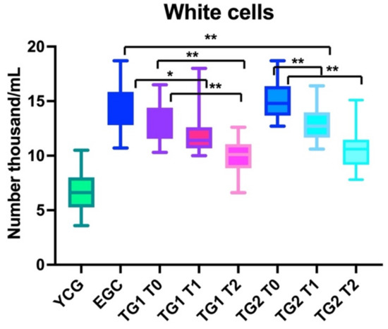 The number of lymphocytes was statistically significantly lower when comparing the findings of YCG (ANOVA: p < 0.0001) and EGC at baseline (T0) (BH: p < 0.0001), T1(BH: p < 0.0001), and T2 (BH: p < 0.0001); moreover, the number of white cells in YCG was statistically lower than the number of the lymphocytes in TG1 at T0 (BH: p < 0.01), T1 (BH: p < 0.01), and T2 (BH: p < 0.01). Similar data were observed comparing YCG with TG2 at all observation points (T0, T1, and T2; p < 0.01).