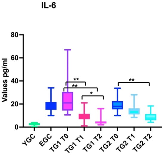 The level of IL-6 was statistically significantly different when comparing YCG (ANOVA: p < 0.0001) and EGC at T0 (BH: p < 0.0001), T1(BH: p < 0.0001), and T2 (BH: p < 0.0001); IL-6 was substantially lower in YGC when compared with TG1 at T0 (BH: p < 0.01), T1 (BH: p < 0.01), and T2 (BH: p < 0.01). Similar data were observed when comparing IL-6 of YCG with the values of TG2 at all observation points T0, T1 (BH: p < 0.01), and T2 (BH: p > 0.05).