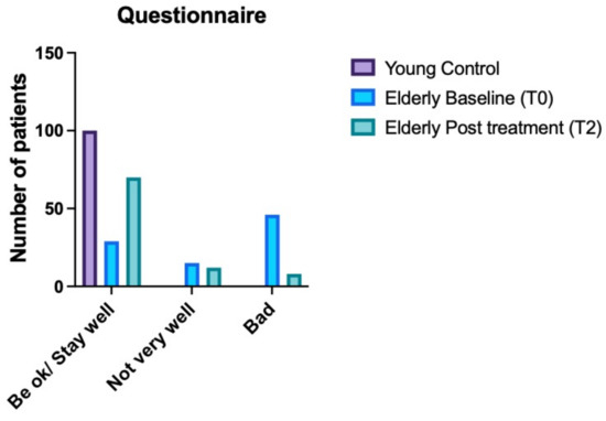 All YGC subjects were healthy, and they felt well (answered that they are “ok”). Among the elderly patients, 32.2% (29 subjects, including untreated and treated patients) reported that they felt well (answered “I am well”), 16.7% (15 subjects) reported that they felt “not very well”, and the remaining 51.1% (46 subjects) reported that they felt bad at the baseline (T0). At T2, 8% (8 subjects) reported that they felt bad (none in TG1 and TG2), 13.3% (12 subjects) reported feeling quite well (2 in the ECG, 4 in TG1 and 6 in TG2) and 77.7% (70 patients) reported that they have been staying well (answered that they are “ok”) (Figure 5).