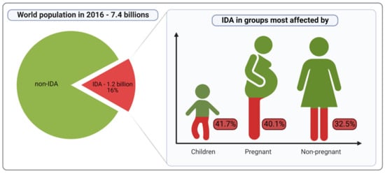 Iron deficiency (ID) and iron deficiency anaemia (IDA) are important causes of diseases and disabilities worldwide. In 2016 there were over 1.2 billion cases of IDA, of which 41.7% of children (younger than 5 years), 40.1% of pregnant women, and 32.5% of non-pregnant women were anaemic worldwide; thus, IDA is one of the world’s primary public health issues (Figure 1), [,,]. For the World Health Organization (WHO), controlling anaemia is a global health priority with the purpose of a 50% reduction in anaemia prevalence in women by 2025 []. IDA mainly affects premenopausal and pregnant women, growing children and the elderly, however, it is also increasingly recognised as a complication of multiple diseases associated with lifestyle and dietary patterns, such as obesity, inflammatory bowel disease, colorectal cancer or chronic kidney disease [,].
