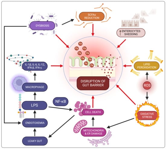 Iron-related gut barrier disruption mechanisms. SCFAs—short-chain fatty acids; IFN-β—interferon β; IFN-γ—interferon-γ; IL-1β—interleukin 1β; IL-6—interleukin 6; IL-12—interleukin 12; LPS—lipopolysaccharide; NF-kβ—nuclear factor kappa-light-chain-enhancer of activated B cells; ROS—reactive oxygen species.