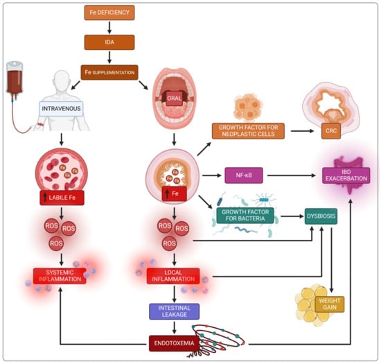 There are two goals of the IDA treatment, to replenish iron stores and normalise haemoglobin concentration. Individual assessment of IDA causes and amount of dietary iron intake is recommended. The holistic nutritional strategy to treat and avoid iron deficiency in the future includes the two paths regarding iron intake and absorption. First is to increase the iron intake by promoting the consumption of iron-rich food such as meat, poultry, fish, and seafood. To optimise iron absorption it is recommended to increase vitamin C and fermented product intake and avoid the consumption of iron absorption inhibitors (phytates in cereals and nuts, tannins from coffee or tea and calcium-rich products) together with iron-rich food []. Although a described holistic approach to clinical management of ID is available, oral or parenteral iron products with varying doses and formulations are the primary means of supplementation []. However, there is a growing body of evidence for side effects of iron supplementation concerning the exacerbation of inflammation, alterations in gut microbiota, and gastrointestinal adverse events []. Therefore, this review aimed to investigate the knowledge regarding the relationship between iron supplementation, inflammatory status and changes in the gut microbiota milieu in diseases typically complicated with IDA and considered as having an inflammatory background, including inflammatory bowel disease, colorectal cancer, and obesity.