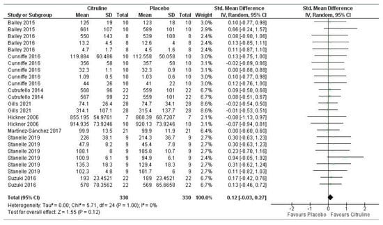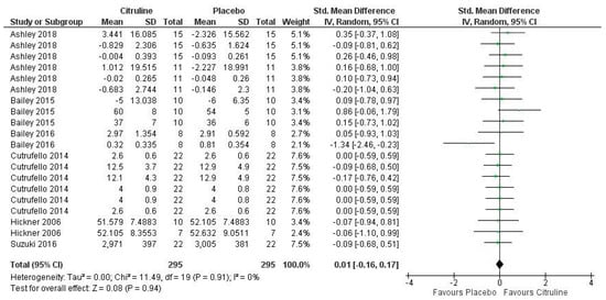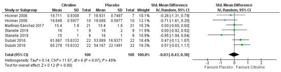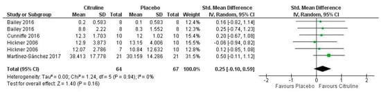 | Cutrufello et al., 2014 [48] | Eleven healthy men (20.6 ± 1.2 years) and eleven healthy women (21.0 ± 1.3 years); intercollegiate team players. | Randomized, double-blind, crossover, placebo-controlled; 6 g L-Citrulline in 710 mL sucrose solution ingested 1 or 2 h before the test. | Bruce’s treadmill protocol to exhaustion. |