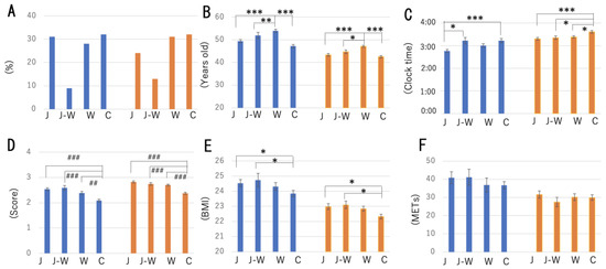 Interaction between various parameters and breakfast meal category. (A) Preferences for each meal category. Associations between age (B), MSFsc (chronotype) (C), eating period (D), BMI (E), exercise (total METs) (F), and meal category. Blue column—male; orange columns—female. Statistical significance was revealed using ANOVA followed by Tukey’s multiple comparison post hoc test: * p < 0.05, ** p < 0.01, *** p < 0.001, or Kruskal–Wallis’s test followed by Dunn’s multiple comparison post hoc test: ## p < 0.01, ### p < 0.001. J—Japanese meal; J-W—Japanese and Western meals; W—Western meal; C—cereal meal.