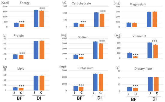 Intake of each nutrient in Japanese or cereal breakfast styles at breakfast and daily intake. All data were obtained from women. The columns represent the mean and standard errors. Two-group differences were statistically analyzed using the Student’s t-test. *** p < 0.001. J—Japanese meal; C—cereal meal. BF—breakfast; DI—daily intake.